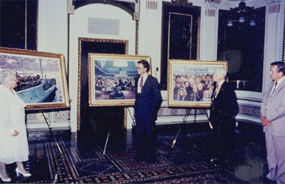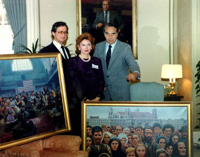 Hans Reinecker, publisher of Dietz Art, presents serigraphs on canvas of Mort Künstler’s Ellis Island trilogy to the White House in a ceremony in 1986. When President Ronald Reagan left office, he took the three serigraphs with him and today, the trilogy can be seen at the Ronald Reagan Library in California.