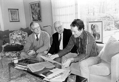 In 1988, Bill Treadaway, left, Director of the Printing Industries of the Carolinas (PICA) and Bill Hall, of Hall Printing in High Point, came to the Oyster Bay home of Mort Künstler to talk about a commission of a painting commemorating the 200th Anniversary of the US Constitution. The meeting resulted in the painting of “We, the People . . .”