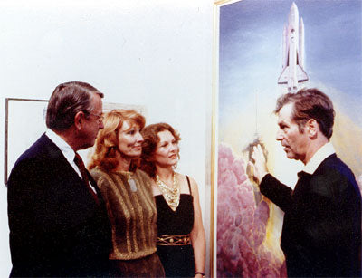 Robert Anderson, CEO of Rockwell International, Mrs. Anderson, Deborah and Mort Künstler are seen here at the opening of the exhibition, “An American Adventure” at the Pittsburgh Center for the Arts in 1981. The painting shown is “First Launch of the Space Shuttle Columbia,” one of a series of paintings Mort Künstler completed documenting the building, testing, first launch and touch down of the Columbia. Commissioned by Rockwell International, prime contractor of the Shuttle, the paintings are now in the permanent collection of the Museum of Science and Technology in Los Angeles.