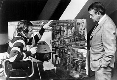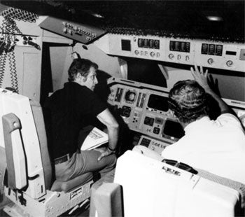 Mort Künstler sits in the cockpit of the Space Shuttle in Houston in 1980 as one of the engineers explains some of the intricate workings of the instruments. Künstler became so interested in the project that he formally applied to NASA to become the first artist to go into space!