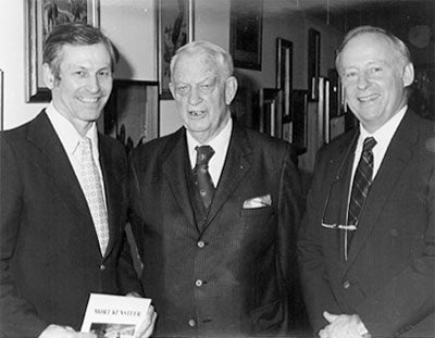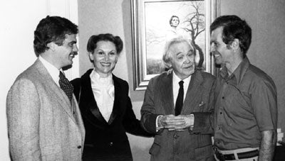 Mort Künstler is seen here with famed historian Henry Steele Commager and his wife, Mary, on October 22, 1979 at the opening of a one-man exhibition of Künstler’s work at the Hammer Galleries, in New York City. Entitled “Epic Paintings of America” it also celebrated the release of Künstler’s first book, of the same name, with a text by Professor Commager.