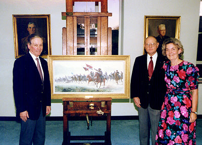 Mort Künstler’s original painting, The Charge at Trevilian Station is unveiled at The Citadel in Charleston, South Carolina in April 1997. Pictured with Mort Künstler is Angie Whaley LeClercq, director of the school’s Daniel Library.