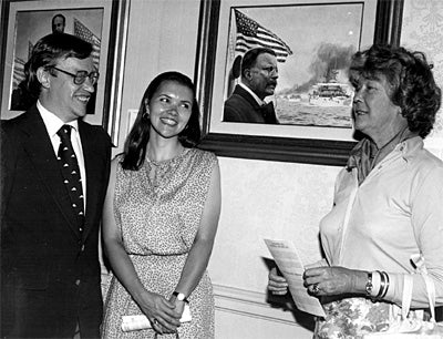 Mr. and Mrs. Tweed Roosevelt and Mrs. Frances Roosevelt at the preview opening of a one-man exhibition of Mort Künstler’s paintings; “Old Glory’s Proudest Moments” at Old Orchard Museum, Sagamore Hill National Historic Site in Oyster Bay, New York. They stand before the Künstler painting “The Great White Fleet Sails” featuring their ancestor, President Theodore Roosevelt, during the summer of 1978.