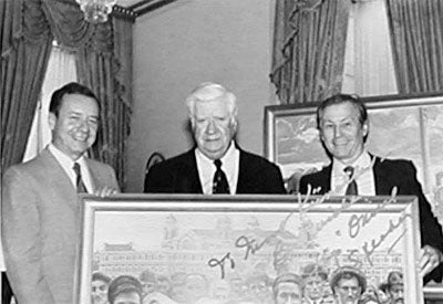 Famed World War II hero Admiral Arleigh A. “31 Knots” Burke is flanked by Mort Künstler and Commander Tad Damon, director of the U.S. Navy Memorial Museum in Washington, DC at the preview opening of the Mort Künstler exhibit, “Epic Paintings of World War II” held at the Museum on December 7, 1982. Admiral Burke, after viewing the forty-four Künstler paintings, wrote “To a wonderful artist - Mort Künstler - with great appreciation and admiration.”