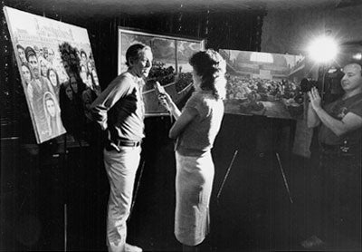 Mort Künstler is being interviewed at the U.S. Merchant Marine Academy in Kings Point, New York. This was in 1986 at the presentation of the serigraph, “First View of the Lady,” center, to the Academy Museum. The museum staff had been helpful in the research for the ship in the painting.