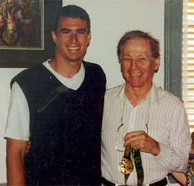 Jeff Rouse, the Olympic swimming champion and gold medal winner for the 100-meter backstroke at the 1996 Olympics in Atlanta, poses with Mort Künstler. Mr. Rouse, a fan of the artist, showed his medal to Künstler at an appearance Künstler made at Fredericksburg Historical Prints, in Virginia.