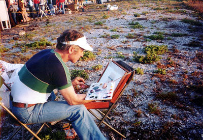 April 12, 1981 brought Mort Künstler to the John F. Kennedy Space Center in Florida to witness the first launch of the Space Shuttle Columbia. He is shown here doing oil studies on site before the launch, which took place at 7:00:10 EST.