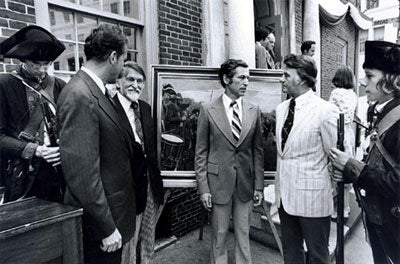 Mort Künstler is seen here in front of Fraunce’s Tavern in New York City on July 4, 1976, the 200th Anniversary of the Declaration of Independence. The occasion is the unveiling of “Reading the Declaration of Independence to the Troops.” Along with Künstler are officials of American Cyanamid, the company that commissioned the painting. Fraunce’s Tavern housed the Departments of Foreign Affairs, the Treasury, and War, from 1785 - 1787. George Washington delivered his famous farewell to his officers here. During this week in 1976, the Tavern causes considerable notice in the press as it coincides with a visit to New York City of Queen Elizabeth.