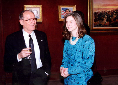 Lou Reda, producer of the famed CBS miniseries “The Blue and the Gray” and many other TV shows, chats with Jane Künstler Broffman, the artist’s daughter, at the preview opening of Mort Künstler’s exhibition, “Epic Paintings of America” on the evening of November 22, 1992.