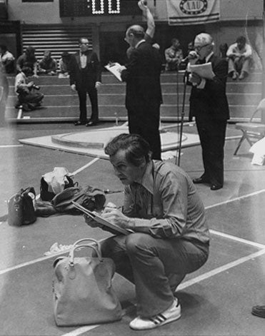 In 1975, Mort Künstler was commissioned by Circle Fine Art and the Amateur Athletic Union to do the official lithograph of their indoor championship meet at Madison Square Garden, New York. Here Künstler sketches on the floor of the Garden during the meet.