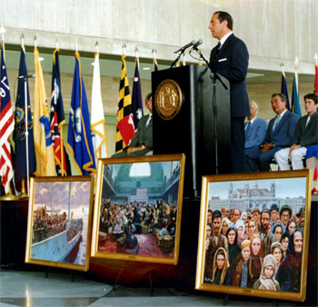 New York Governor Mario Cuomo made a speech in New York City at ceremonies dedicating the reopening of the Statue of Liberty at which the Mort Künstler trilogy on immigration - First View of the Lady, Main Hall - Ellis Island and Freedom - was featured. Attending the Awards Dinner held at the Waldorf Astoria on October 27, 1986 were such luminaries as Bob Hope, Vic Damone, Lee Iacocca, Diahann Carrol, Alan Shepard, John Denver, Cardinal John O’Connor and Barbara Walters!