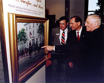 On July 8, 2000, an exhibit of Mort Künstler’s work, “The Confederate Spirit: Valor, Sacrifice, and Honor” opened at the Museum of the Confederacy in Richmond, Virginia. The exhibit was the museum’s first one-man show ever given to a contemporary artist and ran for three months. Pictured here at the opening are (l.-r.) Robin Reed, Executive Director of the Museum, Virginia Governor James Gilmore and Mort Künstler.