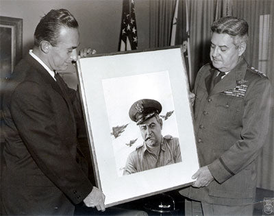 Editor Noah Sarlat presents the Mort Künstler cover painting of the December 1961 issue of Stag Magazine to General Curtis LeMay in the Pentagon office of the General. The cover story is titled “The American General Russia Fears Most – Air Force Chief of Staff Curtis LeMay.”
