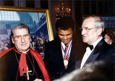 On October 27, 1986, after years of effort, Lee Iacocca, the Chairman of the Statue of Liberty/Ellis Island Foundation saw his dream come true. The statue had reopened and the Ellis island restoration project was well along. That evening, the Ellis Island Medals of Honor Awards dinner was held. The three Mort Künstler paintings were featured at the dinner. Freedom appeared on the cover of the Anniversary Journal. The late Cardinal O’Connor, Muhammad Ali, and Lee Iacocca posed in front of the Künstler painting The Great Hall.
