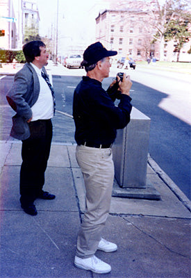 Mort Künstler is shown here with Raymond Beck, historian for the State Capital in Raleigh, North Carolina. Künstler was on a fact-finding trip to Raleigh to research his painting, “Winter Riders.” Mr. Beck says, “As far as I know, [Winter Riders] is probably the most accurate representation of 1860’s Raleigh that’s ever been painted – and it may be the only one.”