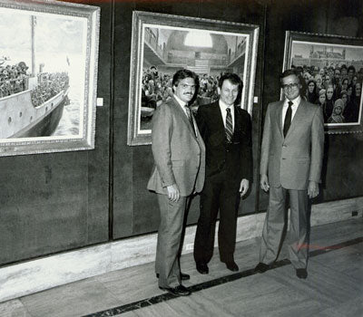 Mort Künstler with Richard Lynch, President of Hammer Galleries and Hans Reinecker of Dietz Art, who commissioned the Ellis Island trilogy. The occasion is the showing for the first time of the three paintings in a one-man exhibition of Künstler’s works at Hammer Galleries in New York City on October 20, 1985.