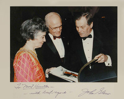 In 1989, Mort and Deborah Künstler were invited to the Marine Corps Command and Staff College Foundation’s annual Semper Fidelis Award Dinner as honored guests. Seated at their table, as dinner partners were John Glenn and his wife, Annie. In this photo, Kunstler is showing the Glenns the Space Age chapter of his book, “The American Spirit,” which came out in 1986 and was reissued in 1994.