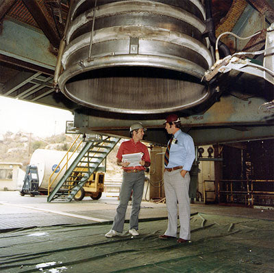 On July 12, 1980, Mort Künstler was at the National Space Technology Laboratories in Bay St. Louis, Mississippi to witness the test firing of the main engine of the Space Shuttle. He is seen asking questions of the engineer in charge.