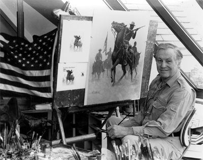 Mort Künstler in front of the easel in 1994 with the painting, sketch, and mock up of the Buffalo Soldiers Stamp he painted for the U.S. Postal Service.