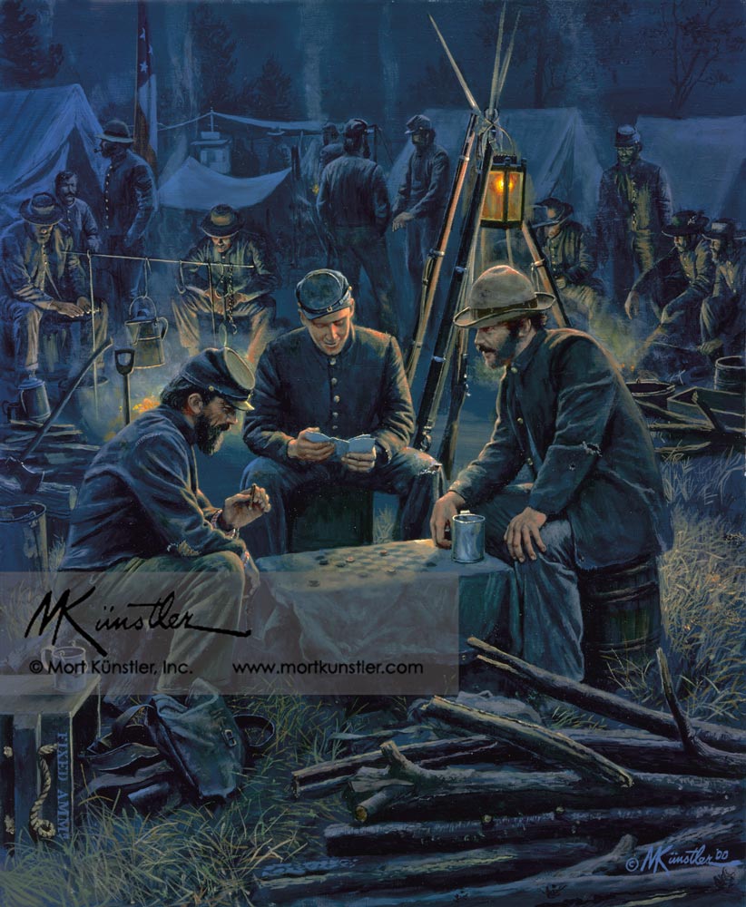 In 1993, I did a book, Gettysburg: The Paintings of Mort Kunstler, which was the official companion book to the Turner motion picture. The book contained a mixed media study with three soldiers playing checkers. It was done as a vignette. After years of thinking about the potential for a finished, squared off painting using that theme, I finally came up with Letter from Home.